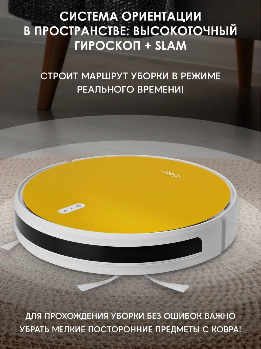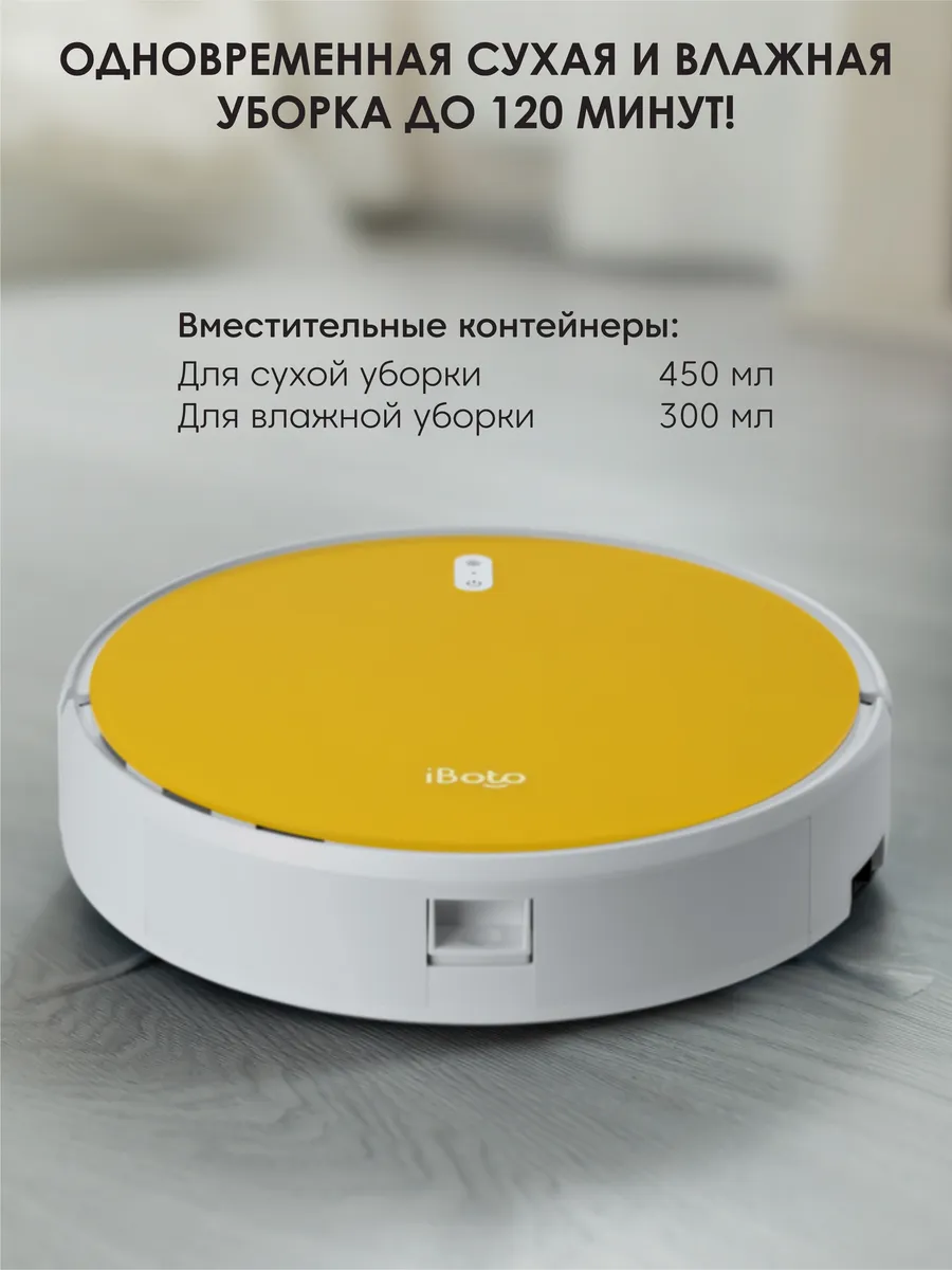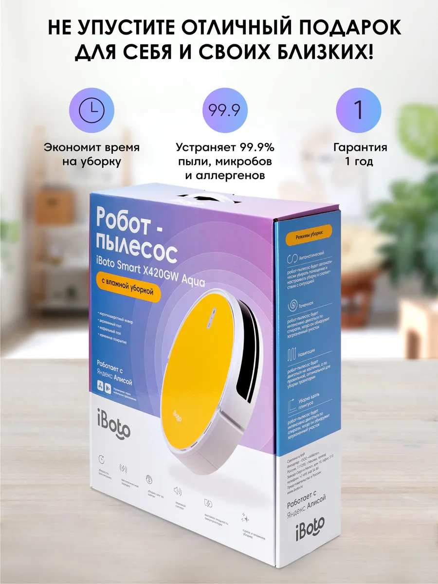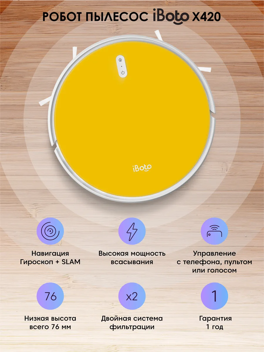 Идеальный робот-пылесос, чтобы делать регулярную уборку вашей квартиры, собирать пыль, шерсть от домашних животных и мелкий мусор, сохраняя полы в чистоте! Робот пылесос для сухой и влажной уборки iBoto X420GW оснащен турбощеткой и двумя боковыми щетками, имеет высокую мощность 2500 Па, низкую высоту 76 мм для уборки в труднодоступных местах, оснащен гироскопом + SLAM для ориентации в пространстве, трехступенчатой системой фильтрации, HEPA фильтром последнего поколения, который задерживает 99,9% частиц пыли, микробов, шерсти и аллергенов!