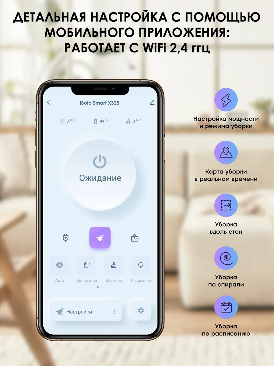 | Управление пылесосом | Голос, Пульт, Смартфон |