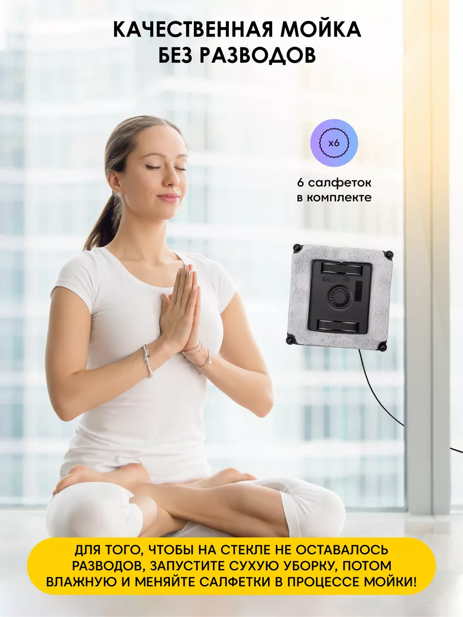 | Комплектация | 1 адаптер; 1 страховочный трос; пульт ДУ — 1 шт; Робот мойщик окон — 1 шт; Салфетки 6 шт |