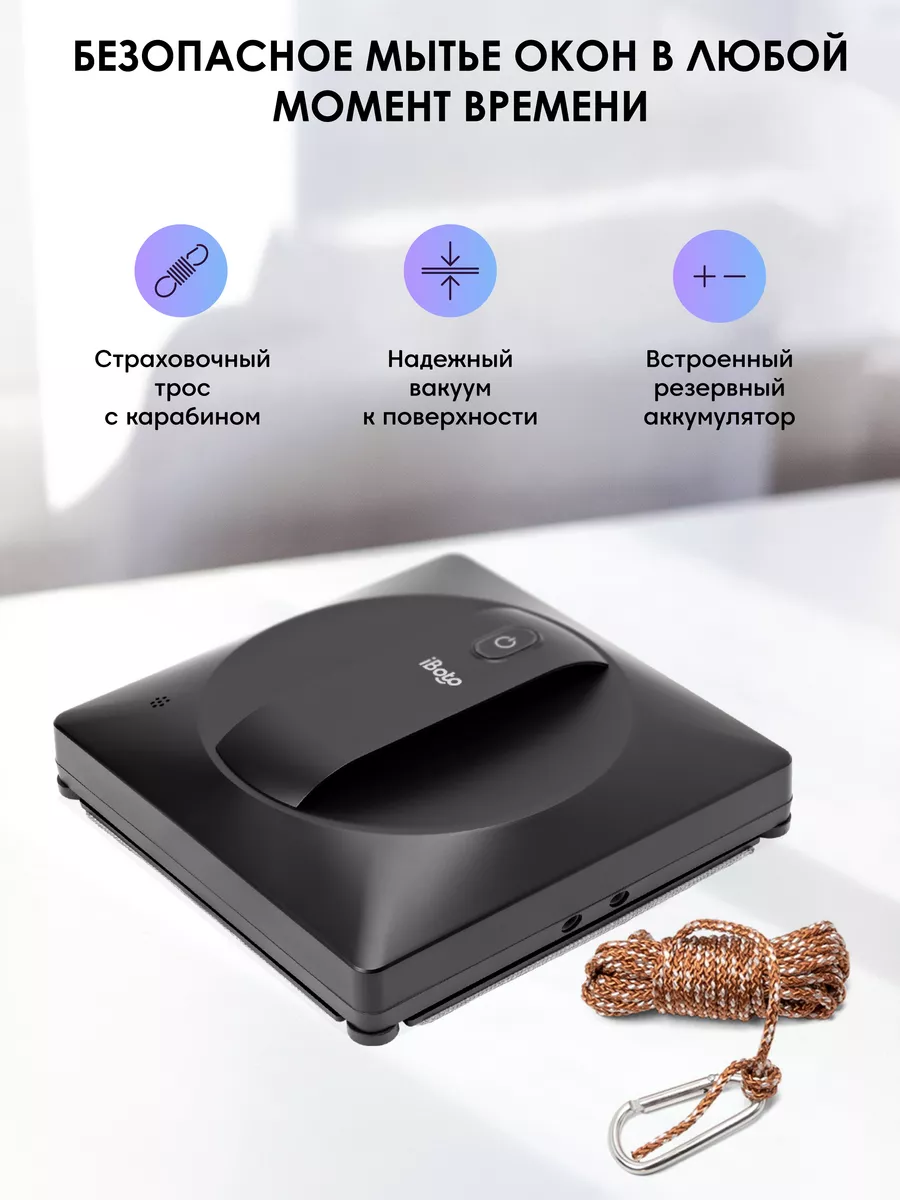 Благодаря мощному вакууму, мойщик окон робот iBoto Win 290 надежно прикрепляется к любой поверхности, закрепляется страховочным тросом (общая длина с кабелем, адаптером и тросом – 7.5 м), а также имеет встроенный аккумулятор резервного питания на 20 минут на случай перебоя с электричеством