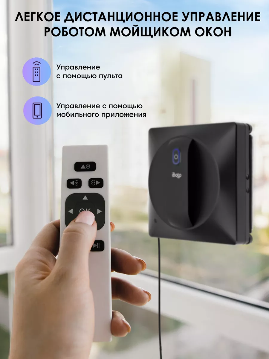 Робот для мытья окон с распылением легко управляется с помощью пульта дистанционного управления или мобильного приложения в фирменном приложении iBoto на русском языке!