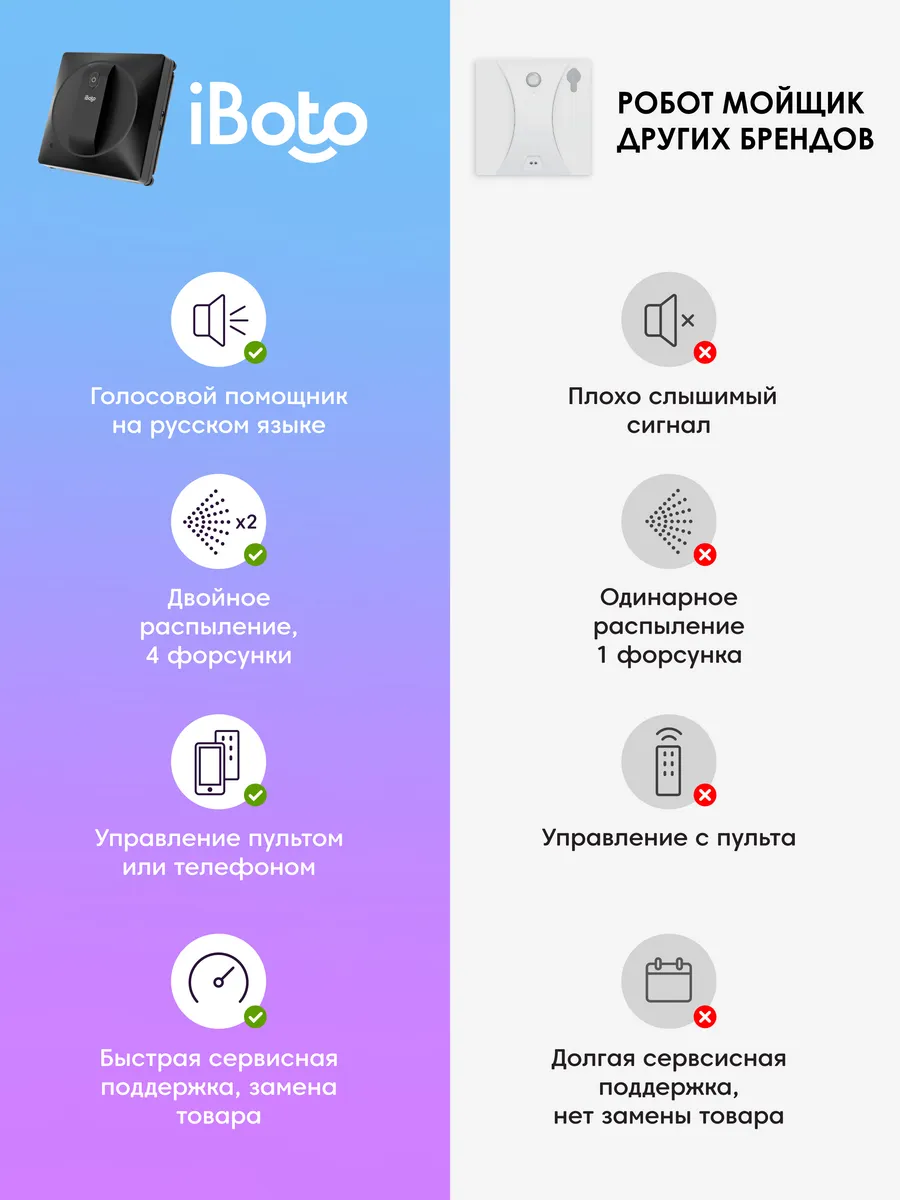 Плюсы: Отличный робот-мойщик! Долго выбирали, но остановились именно на этой модели iBoto. В доме много зеркал и робот чудесно из перемыл, без разводов и голосовой помощник сообщал когда начало и конец очистки. А благодаря встроенным датчикам очистил каждый сантиметр площади зеркал (окна пока не пробовали мыть)