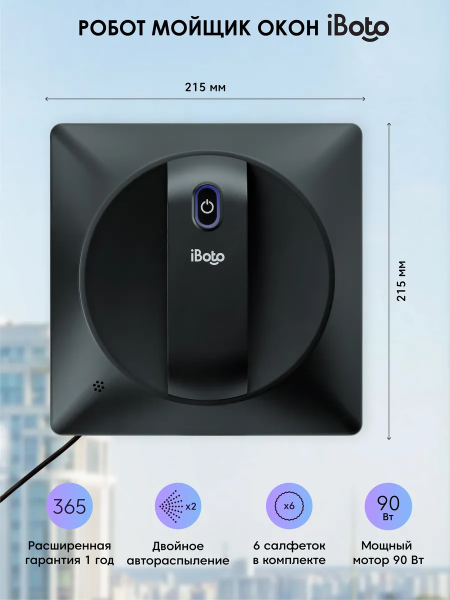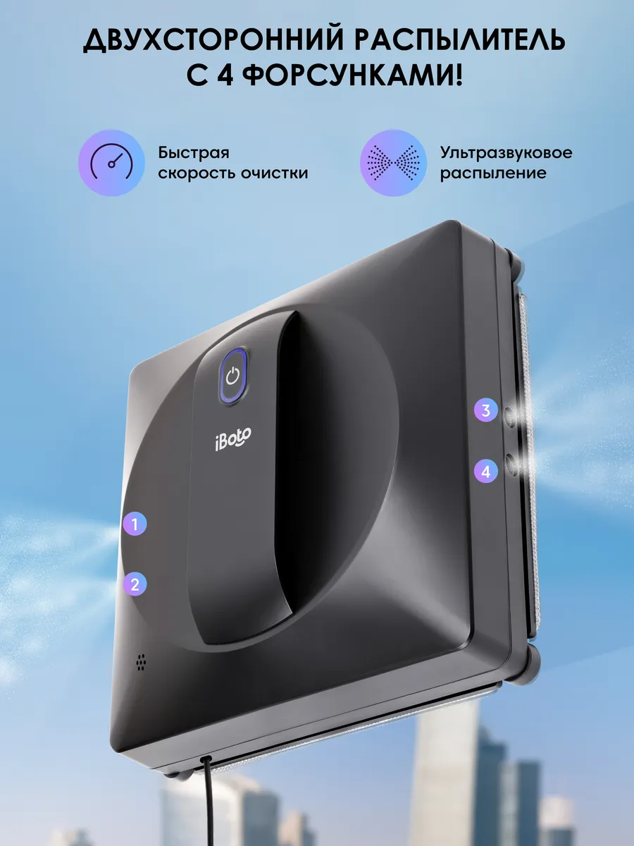 Умный робот мойщик окон с распылением c двух сторон iBoto Win 290 от специализированного на робототехнике бренда iBoto – это идеальный мойщик окон робот, чтобы экономить вам время и деньги на мытье окон, безопасно мыть любую вертикальную и горизонтальную поверхность в квартире или доме: окна от 45 см, зеркала и многое другое, не оставляя разводов, не царапая и не повреждая поверхность! Робот мойщик окон будет прекрасным помощником в решении проблемы безопасного мытья окон на высоких этажах!