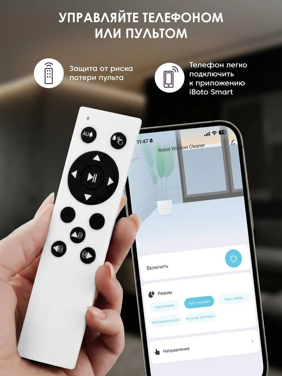 Робот для мытья окон с распылением легко управляется с помощью пульта дистанционного управления или мобильного приложения в фирменном приложении iBoto на русском языке!