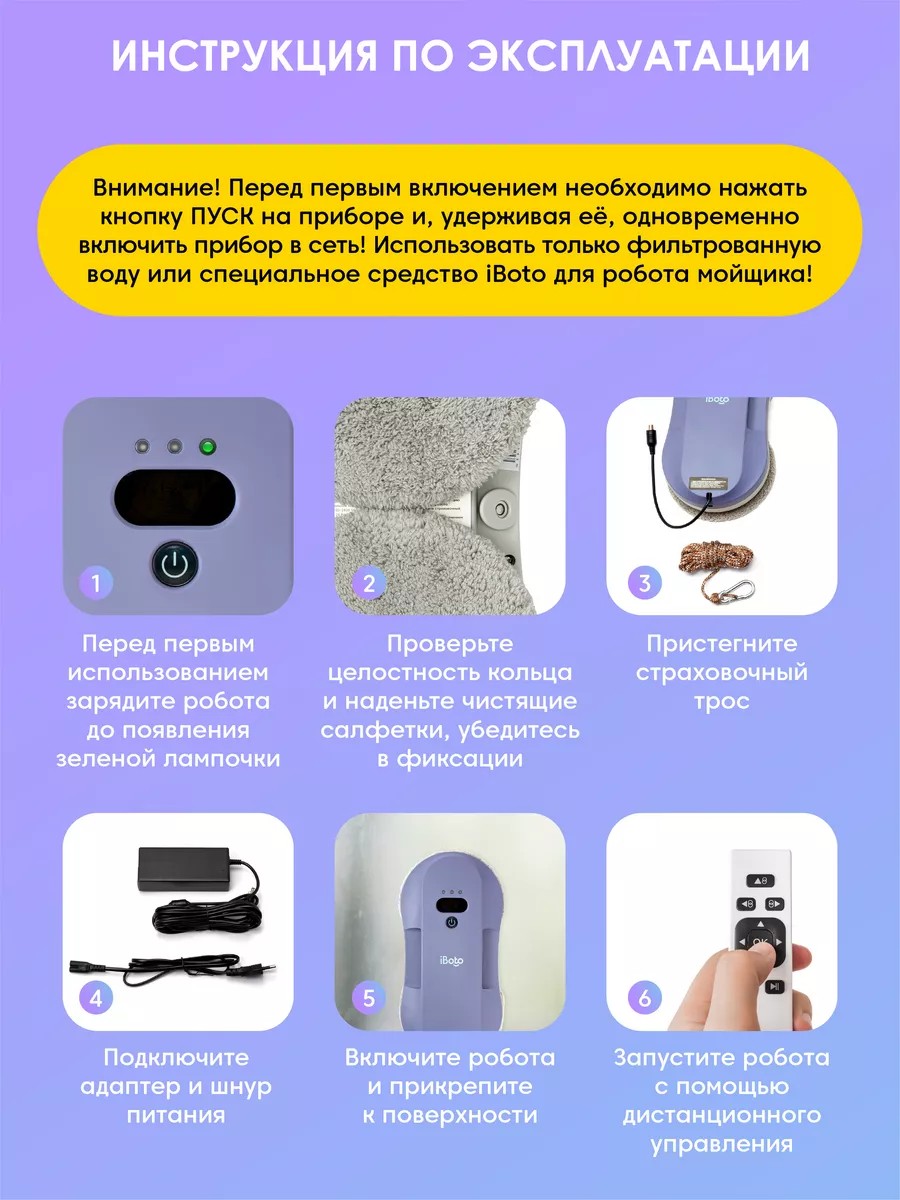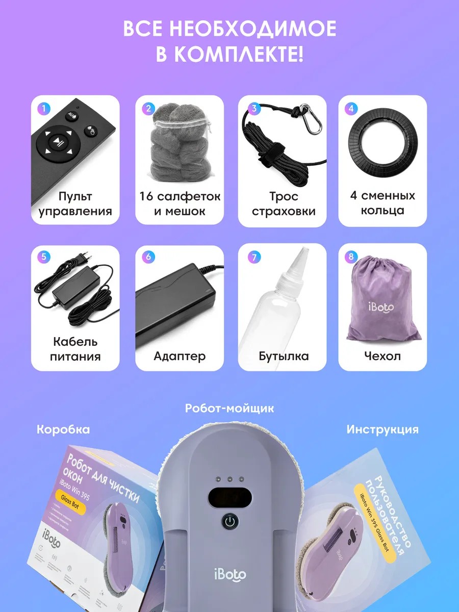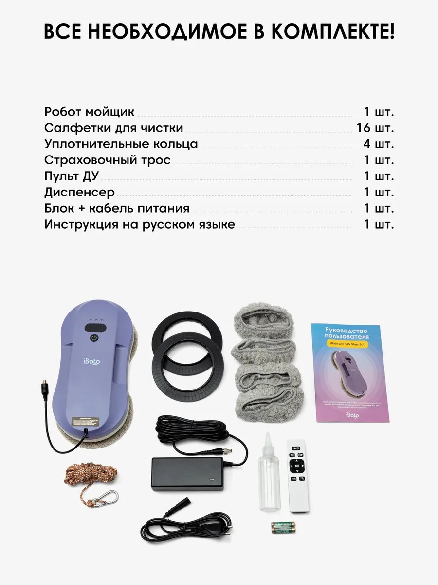 | Комплектация | 1 адаптер; 1 страховочный трос; пульт ДУ — 1 шт; Робот мойщик окон — 1 шт; Салфетки 6 шт |