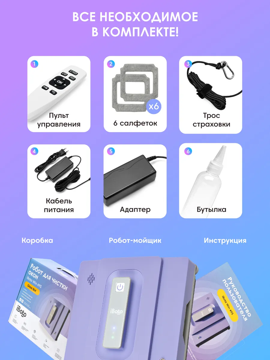 | Комплектация | 1 адаптер; 1 страховочный трос; пульт ДУ — 1 шт; Робот мойщик окон — 1 шт; Салфетки 6 шт |