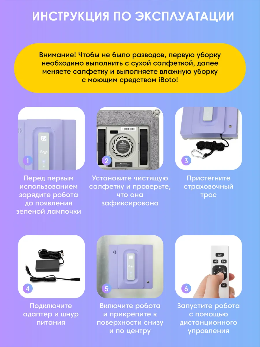 Мойщик окон робот идеально помоет ваши окна и другие поверхности в доме. Для этого соблюдайте инструкцию по эксплуатации: запустите сначала сухую уборку, а после выполнения цикла влажную с использованием специального моющего средства iBoto! В процессе мойки регулярно меняйте салфетки, в комплекте 6 штук! Перед началом уборки прикрепите мойщика снизу убираемой поверхности!