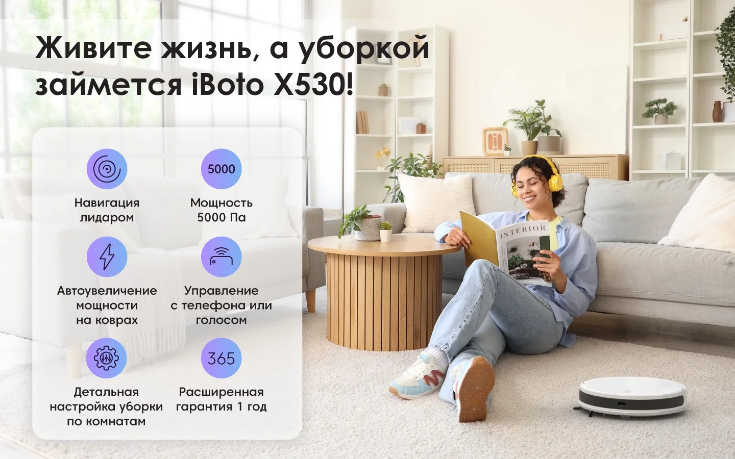 Пользуюсь iBoto Smart X530 уже несколько месяцев — полностью доволен! Робот уверенно ориентируется в пространстве, не застревает под мебелью и убирает даже в углах. Отлично справляется с шерстью животных, что для меня было очень важно. Автономность на высоком уровне — хватает на всю квартиру (около 60 м²) без подзарядки. Хороший выбор за свои деньги!