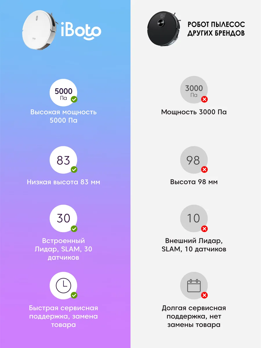 Плюсы: Качество уборки, дизайн, возможность ставить виртуальные стены, голосовое оповещение, программа отслеживает степень износа комплектующих