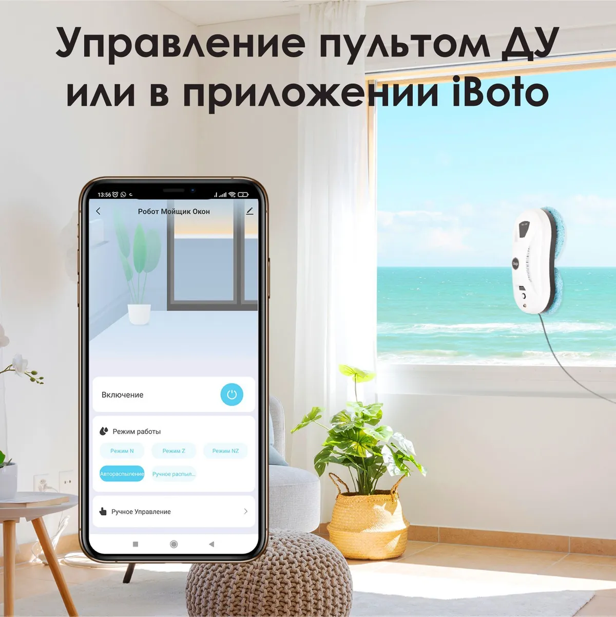 Управление пультом ДУ или в приложении iBoto