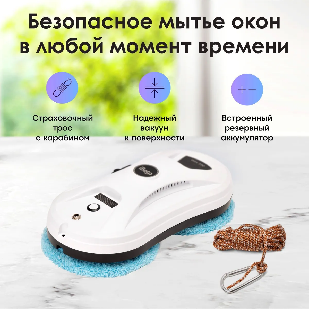 Благодаря мощному вакууму, роботдля мойки окон iBoto Win 390 надежно прикрепляется к любой поверхности, закрепляется страховочным тросом (общая длина с кабелем, адаптером и тросом – 7.5 м), а также имеет встроенный аккумулятор резервного питания на 30 минут на случай перебоя с электричеством