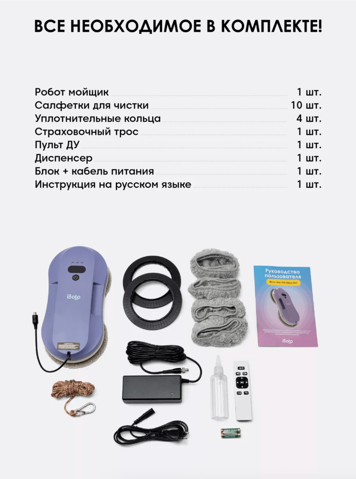 Мойщик окон робот идеально помоет ваши окна и другие поверхности в доме. Для этого соблюдайте инструкцию по эксплуатации: запустите сначала сухую уборку, а после выполнения цикла влажную с использованием специального моющего средства iBoto! В процессе мойки регулярно меняйте салфетки, в комплекте 10 штук! Перед начало уборки прикрепите мойщик снизу убираемой поверхности!