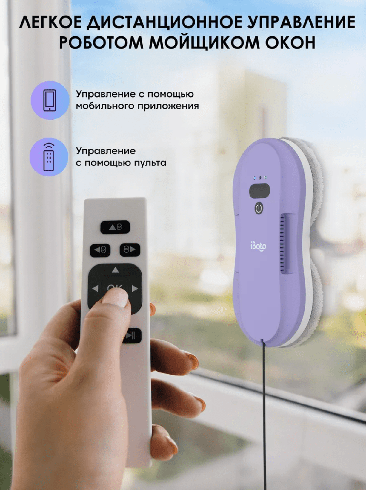 Робот для мытья окон с распылением легко управляется с помощью пульта дистанционного управления или мобильного приложения в фирменном приложении iBoto на русском языке!
